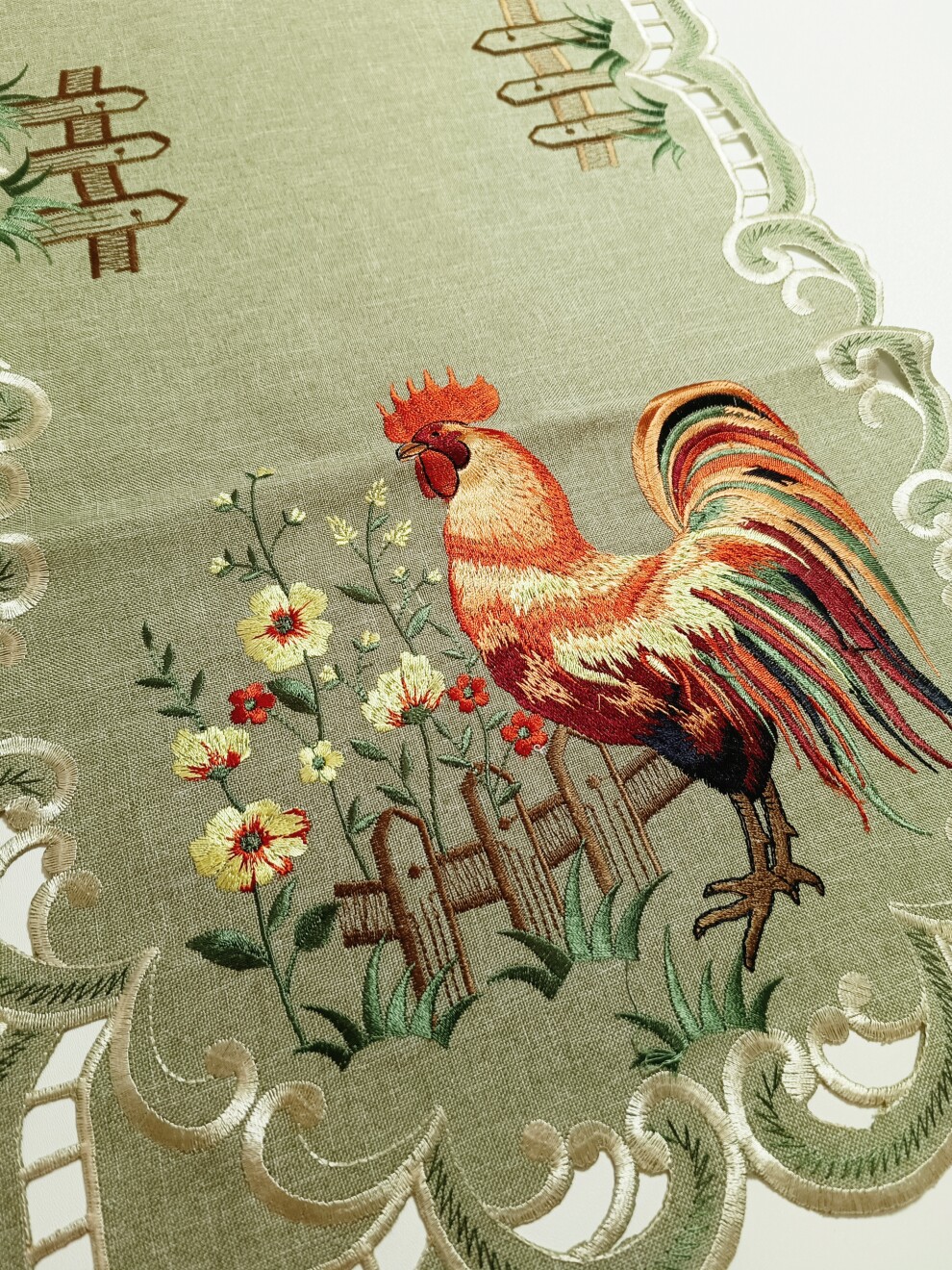 Праздничная столовая дорожка с аккуратной вышивкой гладью превращает стол в настоящую пасхальную сцену: гордый петух, словно солнечный будильник, возглашает утро Светлого дня. Мягкий блеск глади напоминает первые лучи зари 🕊️🌿🕯️