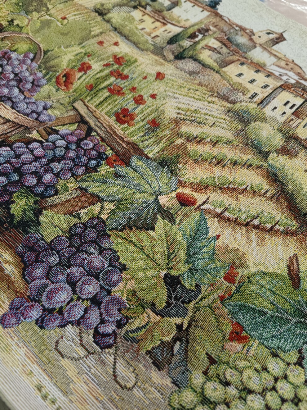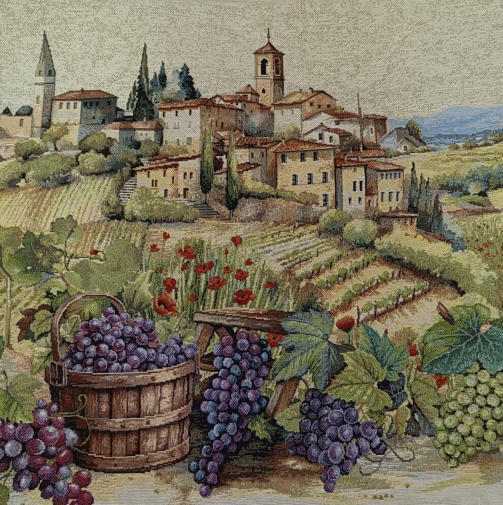 На фактурном гобелене раскрывается пейзаж с рядами лоз, налитыми гроздьями и мягким светом заката 🌿✨. Такое оформление действует как маленькая картина в текстиле — и для глаз, и для настроения 🖼️🛋️.