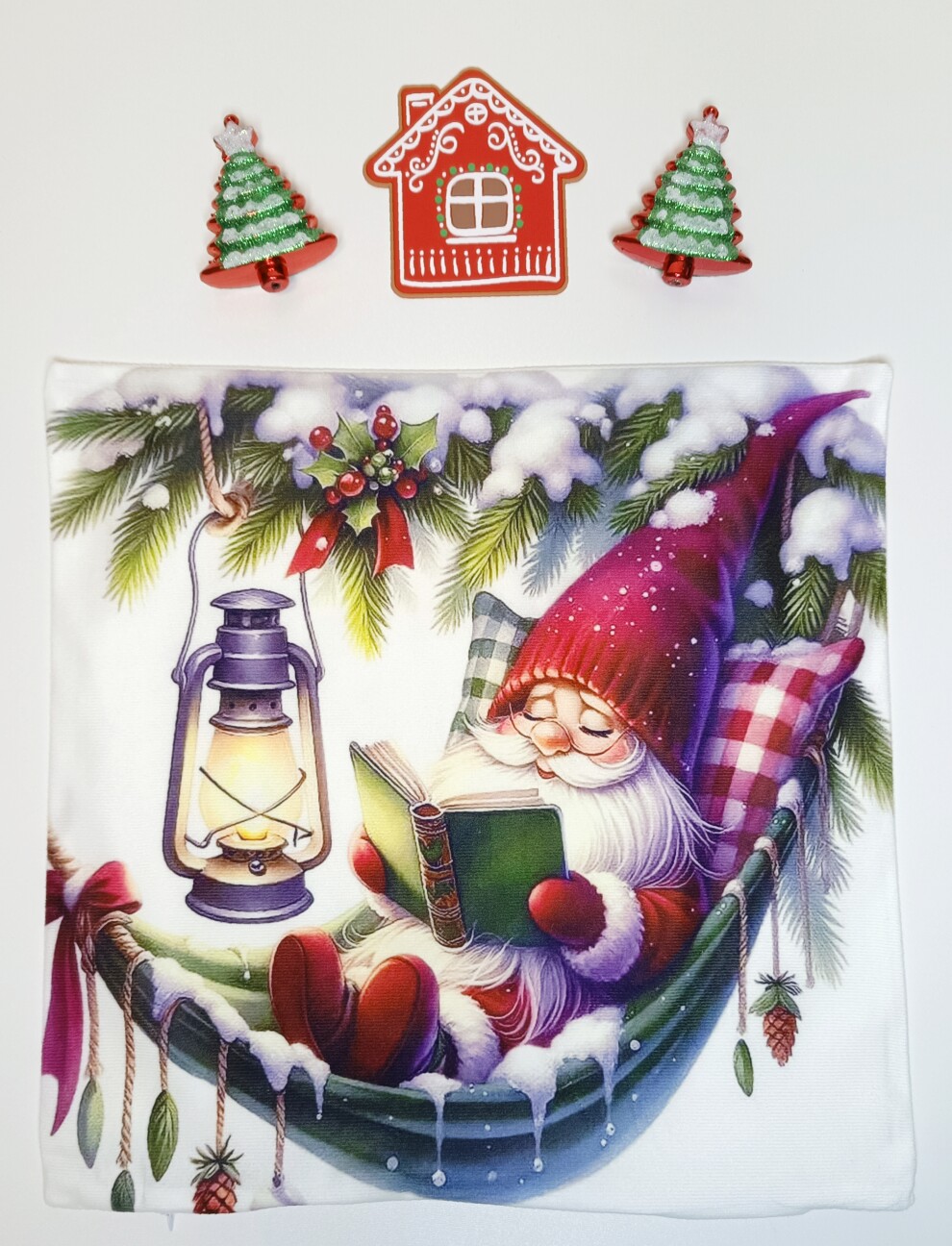 Мягкий, как облачко, велюр обнимает ладони, а озорной гномик улыбается с наволочки, будто шепчет: “Скоро сказка!” 🙂 Диодные огоньки мерцают теплым светом — словно зимние звездочки, что поселились у вас на диване 🌟🛋️