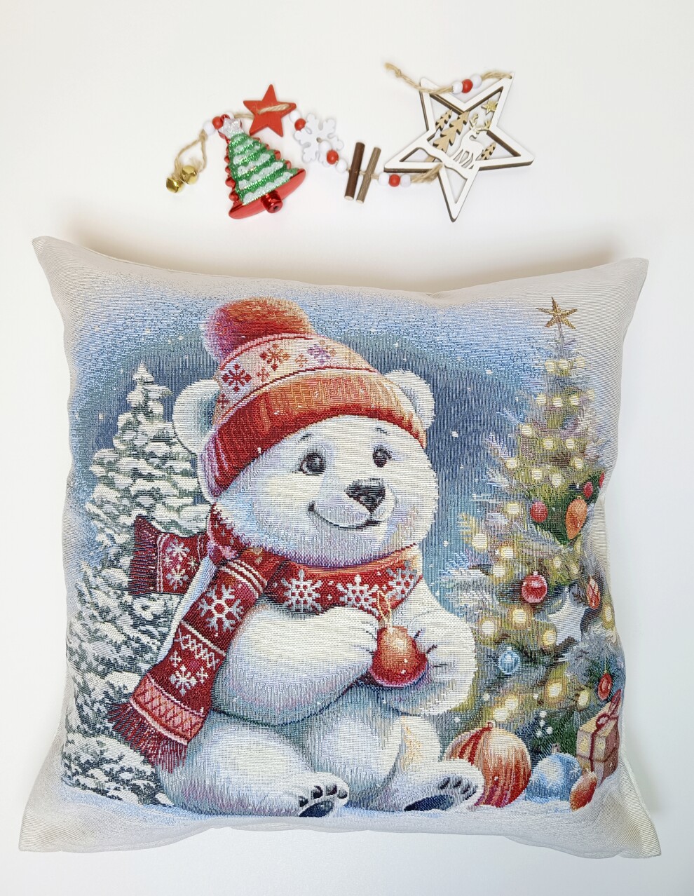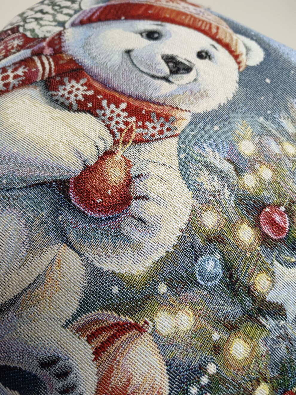Эта праздничная наволочка превращает диван в место, где живёт сказка: фактурный гобелен с милым мишкой и нарядной ёлочкой дарит тепло, как кружка горячего какао в морозный вечер ☕❄️✨