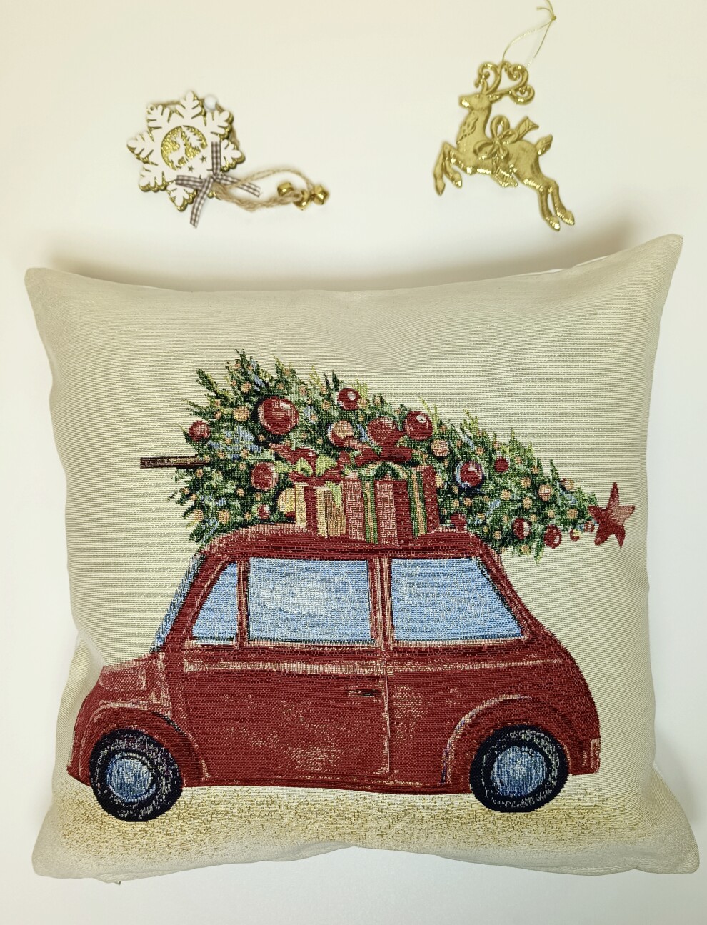 Новогодняя гобеленовая наволочка, где маленький авто мчится домой с пушистой елочкой на крыше, а люрексовые искорки мерцают, будто морозный иней на рассвете. Уютная, нарядная и моментально создающая атмосферу праздника 🎄🚗✨